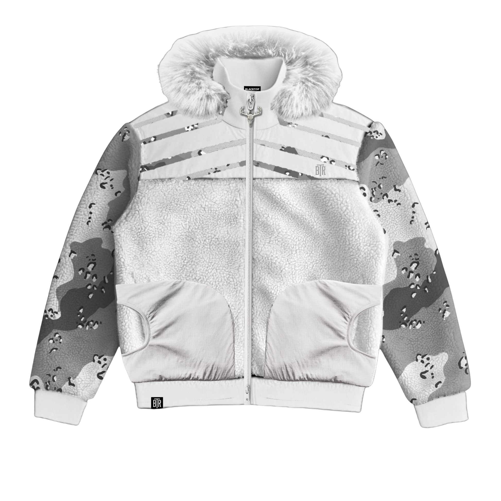 Designed for cold-weather performance with elevated street presence, the Arctic Camo Jacket blends technical warmth with bold visual structure. A plush faux-fur collar frames the neckline for added insulation and luxury feel, while the layered panel construction creates depth, dimension, and standout character.